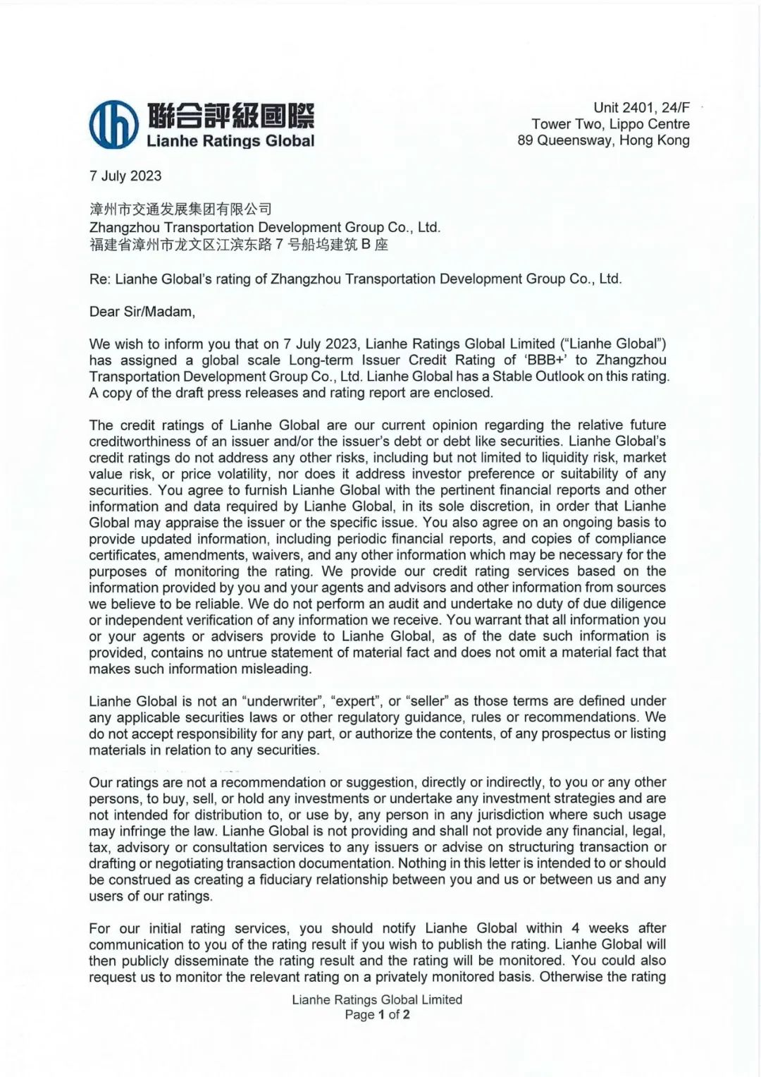7月7日,經(jīng)國際權(quán)威評級機構(gòu)(聯(lián)合國際評級)和國內(nèi)權(quán)威評級機構(gòu)(聯(lián)合資信評估股份有限公司)認(rèn)定,漳州市交通發(fā)展集團有限公司本部及其權(quán)屬二級企業(yè)漳州市交發(fā)建設(shè)集團有限公司分別獲得國際評級BBB+、國內(nèi)AA+主體信用評級,展望穩(wěn)定,實現(xiàn)了漳州交通集團歷史性突破。