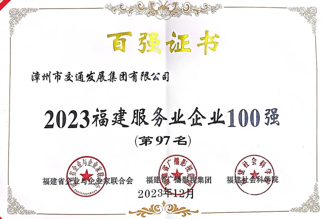12月19日下午,2023福建企業(yè)100強(qiáng)發(fā)布大會在三明召開,漳州交通集團(tuán)榮登2023福建服務(wù)業(yè)企業(yè)100強(qiáng)。