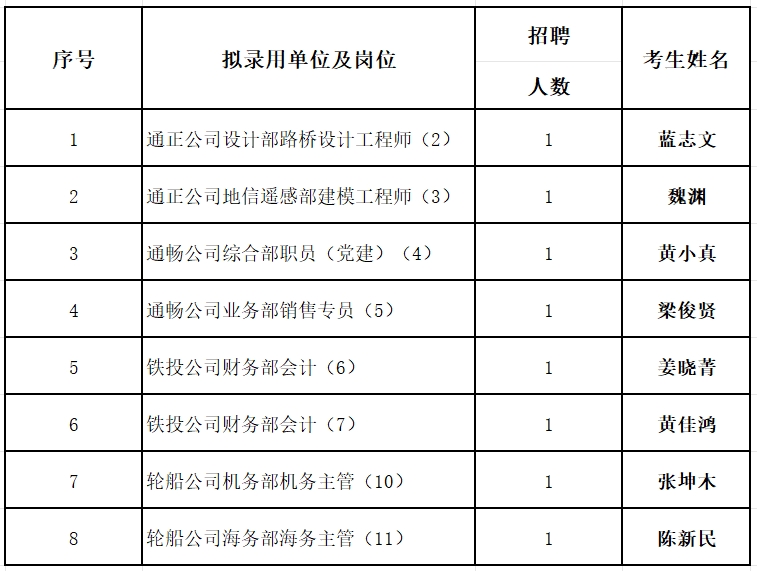 根據(jù)《漳州市交通發(fā)展集團(tuán)有限公司2023年“人才漳州月”赴外公開(kāi)招聘公告》的相關(guān)規(guī)定,經(jīng)資格審查、初面、復(fù)面、體檢、政審等程序,現(xiàn)將擬錄用8名人員予以公示,公示時(shí)間為2024年1月19日至2024年1月25日(五個(gè)工作日)。公示期間歡迎群眾來(lái)電、來(lái)信、來(lái)訪(fǎng)反映情況。