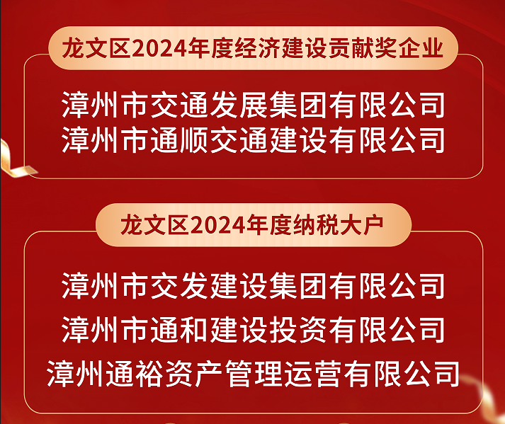 此外,漳州交通集團(tuán)權(quán)屬漳州市通順交通建設(shè)有限公司亦獲得“龍文區(qū)2024年度經(jīng)濟(jì)建設(shè)貢獻(xiàn)獎(jiǎng)”,漳州市交發(fā)建設(shè)集團(tuán)有限公司、漳州市通和建設(shè)投資有限公司、漳州市通裕資產(chǎn)管理運(yùn)營有限公司同時(shí)獲得“龍文區(qū)2024年度納稅大戶”表揚(yáng)。